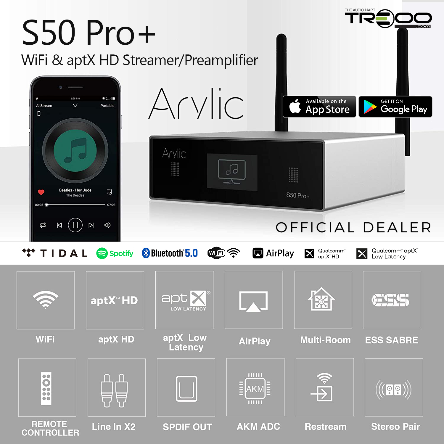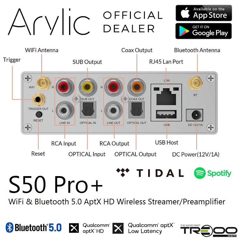 Arylic S50 Pro+ Multi-Room Wireless WiFi, Bluetooth 5.0 aptX HD/aptX Low Latency, Ethernet Network Streamer & Preamplifier
