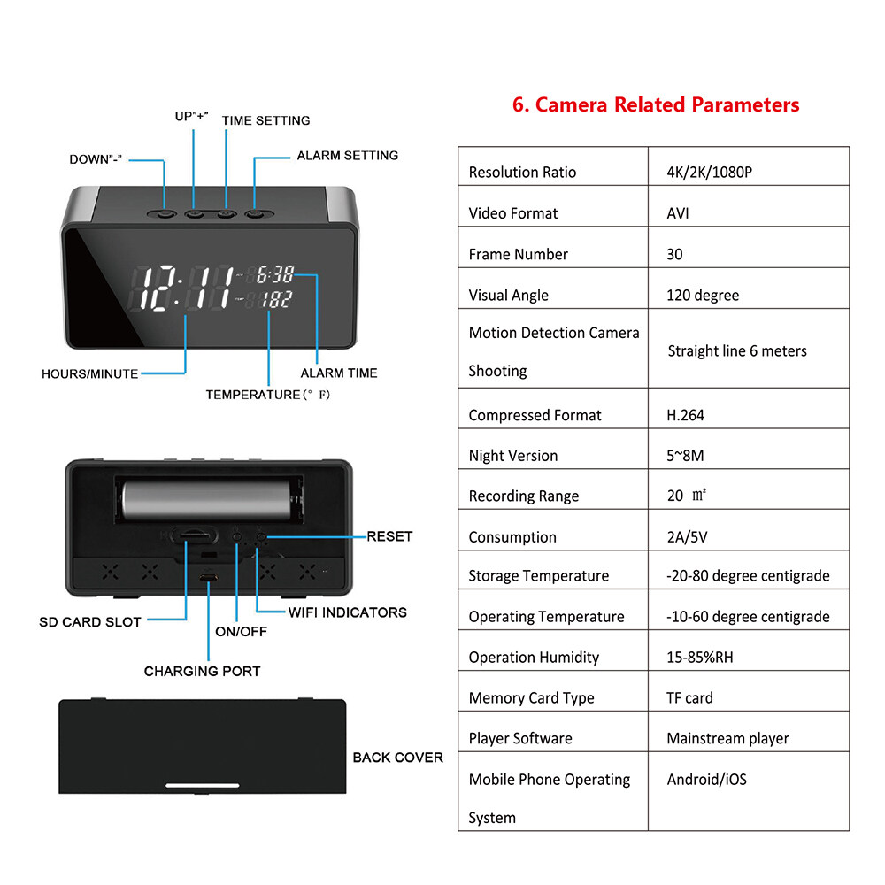 Specification: Name: Wifi electronic clock camera Resolution: 4K/1080P Memory expansion: 128G (not included) Night Vision: Support Battery capacity; 1600mah (included) Weight: 175g Size: 131*37.5*62.5mm