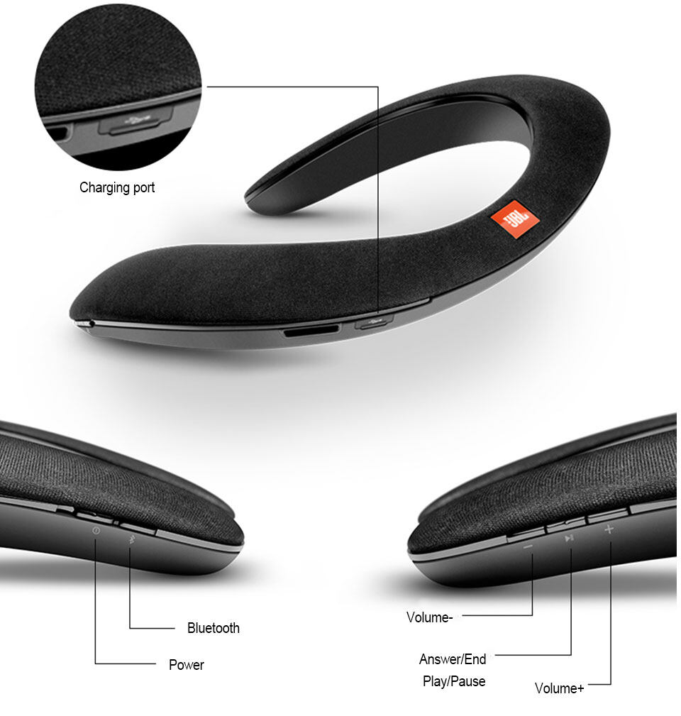 Introducing a totally new way of experiencing sound at home – by wearing it. Thanks to the JBSignature Sound wireless performance, the Soundgear creates your own personal sound zone while allowing you to remain fully aware of your surroundings. Bluetooth®-enabled for sound streaming from compatible devices, the JBSoundgear features Quad transducers with Bass boost for an exciting sound experience and 6 hours of playback time, a quick recharge time of 2 hours. Thanks to its dual mic conferencing system with echo-cancelling technology it provides crystal clear phone calls. The around-the-neck construction, ergonomic shape, intuitive controls, and soft touch fabric finish provide a hands-free and ears-free audio experience unlike any you’ve ever had before. Whether you want to give your VR experience a boost with immersive audio, watch a video, add music to your daily activities around the house or take a conference call, the JBSoundgear provides you with an exciting, pervasive sound experience with total freedom and comfort.