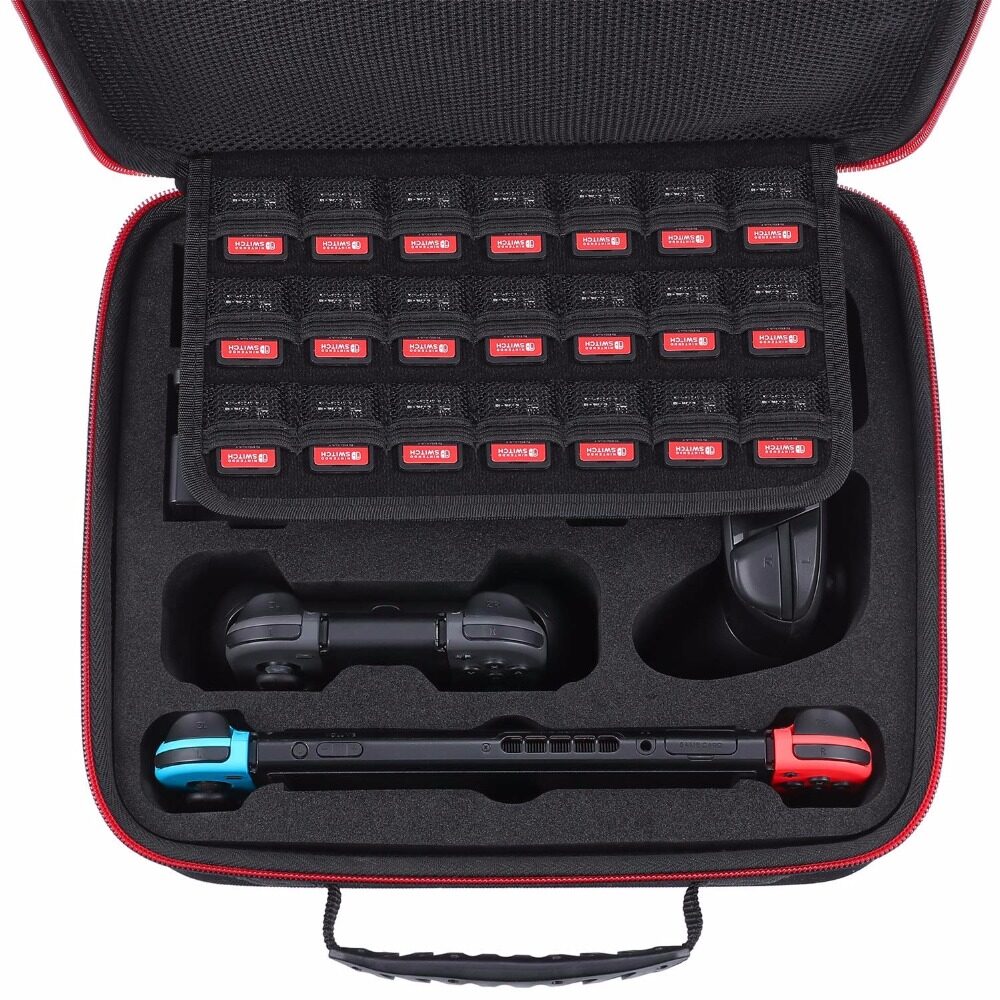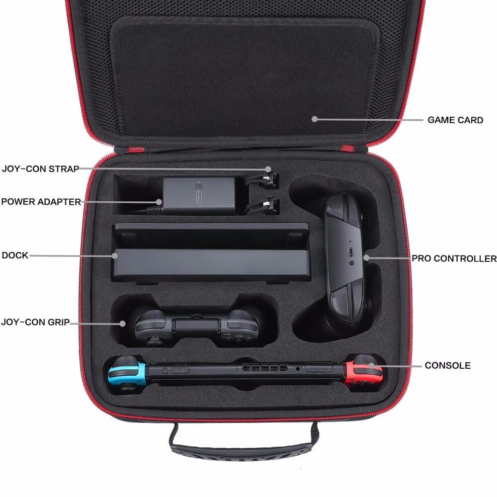 Custom design to fit complete Nintendo Switch system(switch console, dock, power adapter, joy-con grip even with extra joy-con, joy-con straps, and HDMI cable) and extra Switch Pro controller, hold 21 game cards and other little accessories.